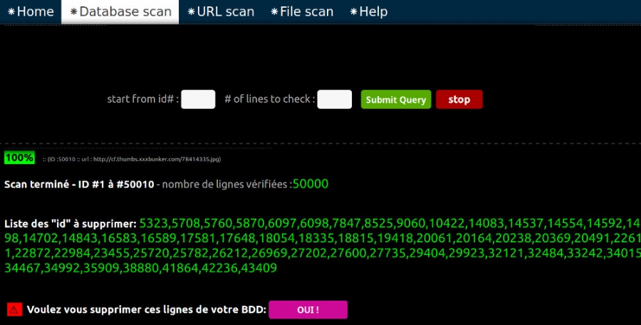 Une fois l'analyse des adresses terminée et si des liens morts ont étés trouvés, le programme listera les clés primaires (id) des lignes concernées. Vous pourrez choisir de supprimer les URL ayant retournés un code d'erreur 404 d'un simple clique sur un bouton, sans quoi aucune donnée ne sera ni modifiée ni supprimée à l'intérieur de votre base de donnée.